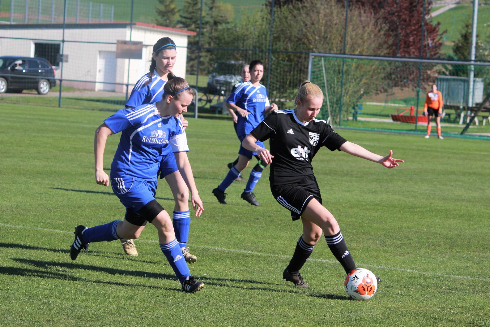 Das Spiel begann für den TSV denkbar gut. Mit einem weiten Pass über die Abwehr schickte Tina Bößl Lena Braungart, die spielte die mitgelaufene Annika Merlein frei, welche dann trocken zur Führung einnetzte (4.). In Minute 8. dann der schnelle Rückschlag: Unsere Mannschaft verpasste es den Ball sofort aus der Gefahrenzone zu befördern, Tina Bößl setzte im Strafraum nach und schon deutete der Schiedsrichter auf den Elfmeterpunkt – fragwürdig. Gnotzheims Kristin Adam legte sich den Ball und ließ unserer Schlussfrau Svenja Burkhardt keine Chance. Der Ausgleich.