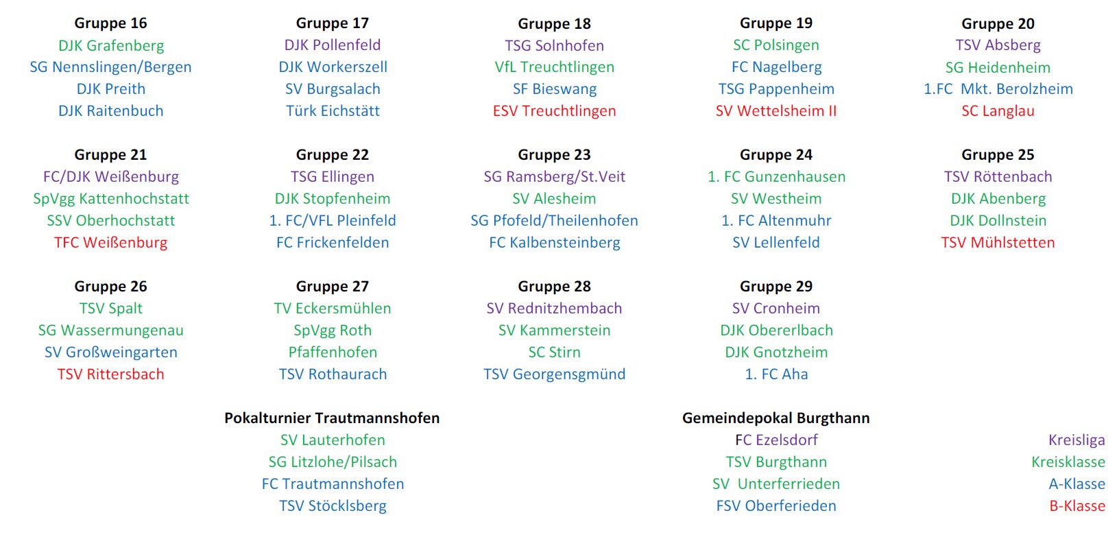 Die gemeldeten Bezirksliga Vereine mit Ausnahme des FC Holzheim, des SV Wettelsheim und des TSV Greding greifen erst im Achtelfinale ein, die drei Vereine spielen bereits in der Gruppenphase mit und werden mit der Liga Ihrer Zweiten Mannschaft eingeteilt.