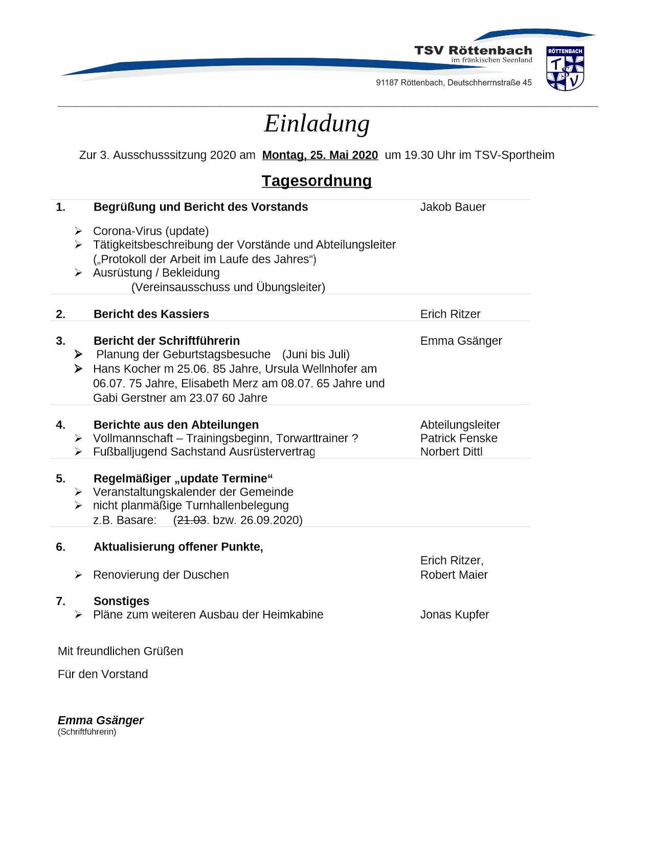 Lieber Leser dieser Homepage, der TSV Röttenbach wird auch weiterhin über sportliche und gesellschaftliche Ereignisse im Verein berichten und da wo es Sinn macht Namen und/oder Fotos von Personen veröffentlichen. Wie in all den Jahren vorher werden wir sehr genau darauf achten, dass die Veröffentlichung von Personendaten dabei immer in einem positiven Zusammenhang steht. Wir sind überzeugt davon, dass dies sehr wohl auch in Ihrem eigenen Interesse geschieht.