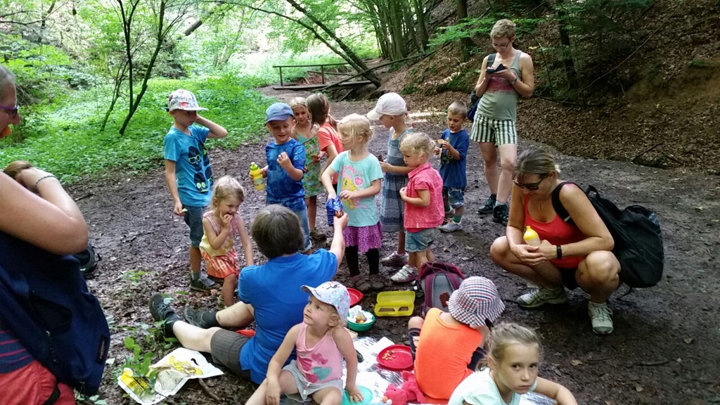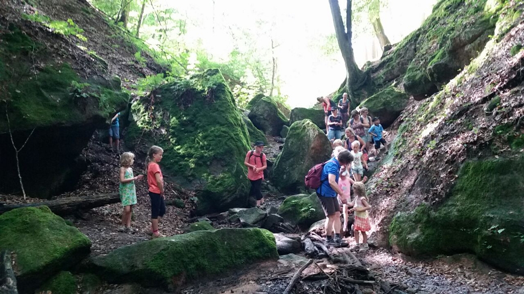 In Fahrgemeinschaften ging es zunächst zum Parkplatz bei der Kapelle vor Massendorf. Schnell hatte die Gruppe den Wegweiser mit dem grünen Punkt gefunden und dann ging es durch den schattigen Wald anfangs noch gemütlich bergab. Anfangs kletterten die Kleinsten noch sehr zögerlich über die großen Steine und suchten eine helfende Hand, doch dann wurden sie immer sicherer. Sie nahmen sich auch Zeit, eine Blindschleiche oder kleine Frösche zu beobachten.