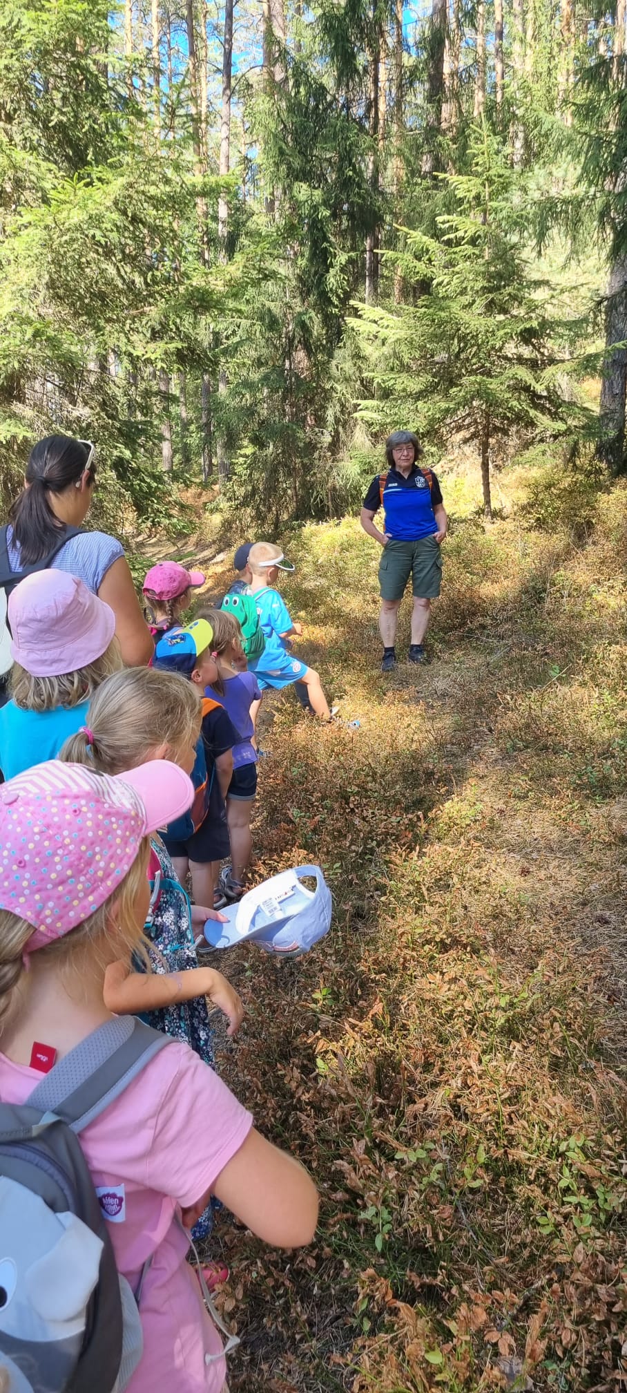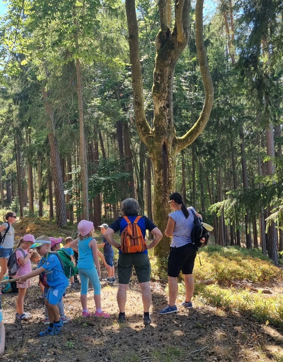 Ganz besonders gewachsene oder irgendwann von einem Blitz getroffene Bäume und auch viele vertrocknete Schwarzbeersträucher wurden entdeckt. Immer wieder war der Blick von oben auf Röttenbach möglich. Noch steiler oder schwieriger ist ja immer der Abstieg, doch den haben die Kinder bravourös gemeistert. Beim Zurückblicken waren sie erstaunt, wie steil der Weg wirklich war.Unten angekommen, galt es, einen blauen Rucksack zu finden. Darin war eine tolle Überraschung, bei dem heißen Wetter war die Melone genau richtig. Gut gestärkt gings dann singend weiter zum Sportheim zu nehmen.